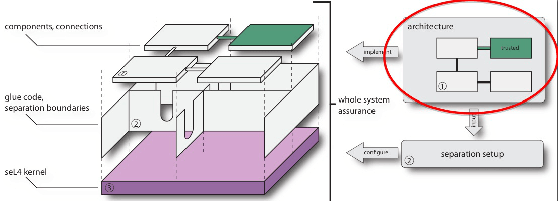 - Trustworthy components: the architecture model maps down to a componentised system with trusted component code, verified glue code and verified system initialisation.