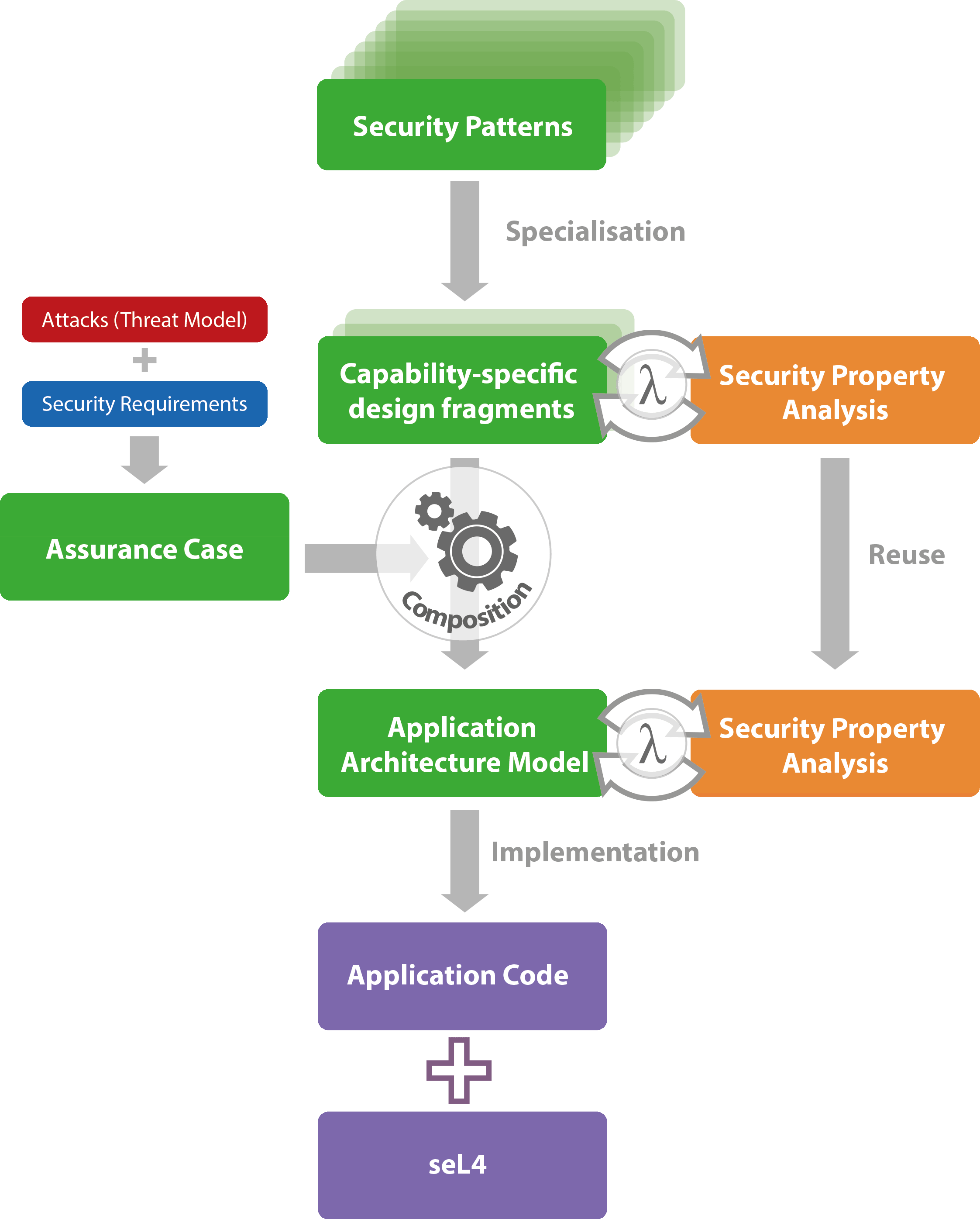 Aim: To build high assurance secure applications through composition of security patterns for capability-based systems and provide assurance about the security properties of the applications.